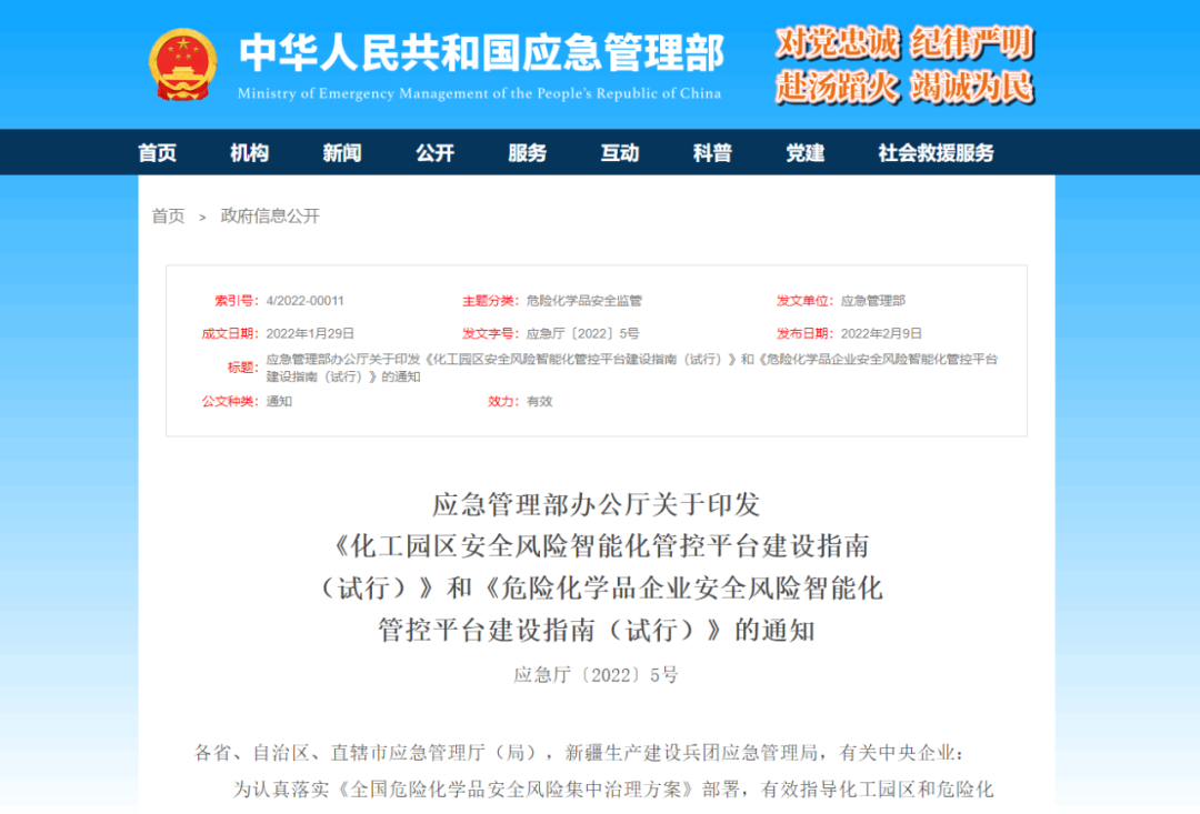 应急管理部印发化工园区和危险化学品企业安全风险智能化管控平台建设指南